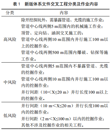 核心是落實(shí)“四防措施”,即人防、物防、技防和信息防相結合,構建管道安全保護防護體系,提升主動(dòng)感知預防風(fēng)險能力。陜京管道按照公司新版體系文件對交叉工程施工風(fēng)險類(lèi)型重新分類(lèi) ,由大型、中型、小型交叉工程管理,改為高風(fēng)險、中風(fēng)險、低風(fēng)險交叉工程進(jìn)行管控(表 1)。新修訂的管控措施更為科學(xué)、合理和適用。高、中、低風(fēng)險的交叉工程分別實(shí)行一、二、三級布控,同時(shí)根據現場(chǎng)風(fēng)險采取人防、物防、技防等措施;對中、高風(fēng)險交叉工程或周邊工程建立施工動(dòng)態(tài)微信群,及時(shí)獲取施工信息,落實(shí)信息防。